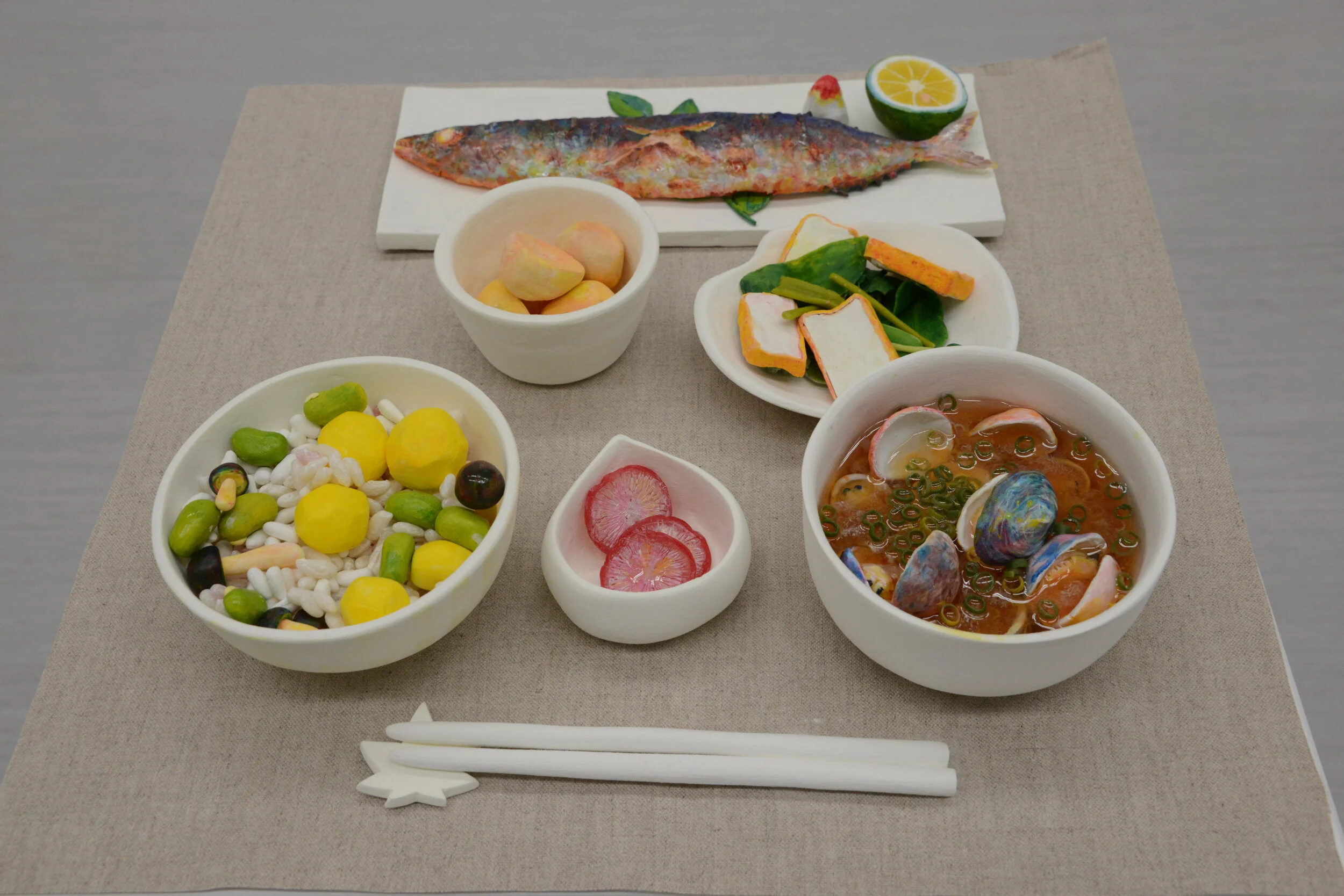 I held a solo exhibition about food and people. I painted the table of spring dish called Ichiju Sansai (one soup and three dishes), in F100 size and “Osechi” (New Year dishes” in 1200 x 1200 mm with oil paintings. I also made autumn Ichiju Sansai in three-dimensional with paper clay, resin clay, and liquid resin. I just wanted to make an exhibition space where people can enjoy, so I thought it would be interesting if there were three-dimensional objects as well as two-dimensional objects. As for portrait, Instead of taking time to draw people precisely, I cherished the senses and creates a vibrant works. Two portraits in F60 with oil paintings and the portraits of various people on Kenran paper with blue acrylic were exhibited. I could see the food and portraits were exhibited in the same space, it was a good opportunity for me to realize it’s important to think deeply about not only the works but also the way of exhibition.